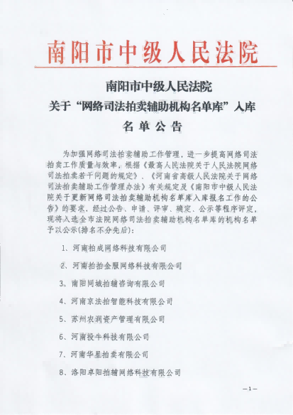 2025年1月入圍南陽市中級法院“網(wǎng)絡(luò)司法拍賣輔助機(jī)構(gòu)名單庫”